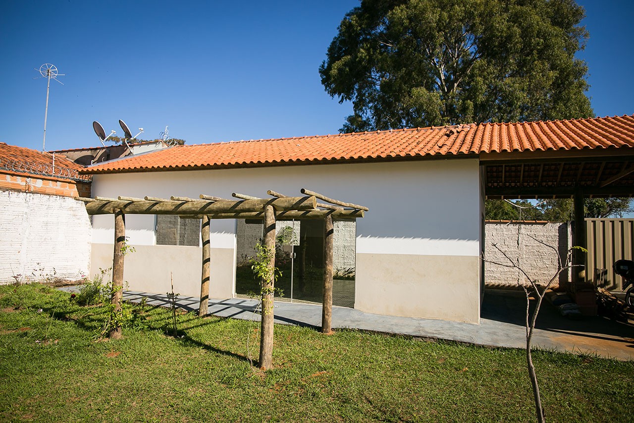 Com o terreno todo gramado, temos algumas árvores frutíferas; abacateiro, pitangueira, goiabeira, entre outras. Com as alas sendo ligadas por varandas e muitos bancos pra descanso e repouso.